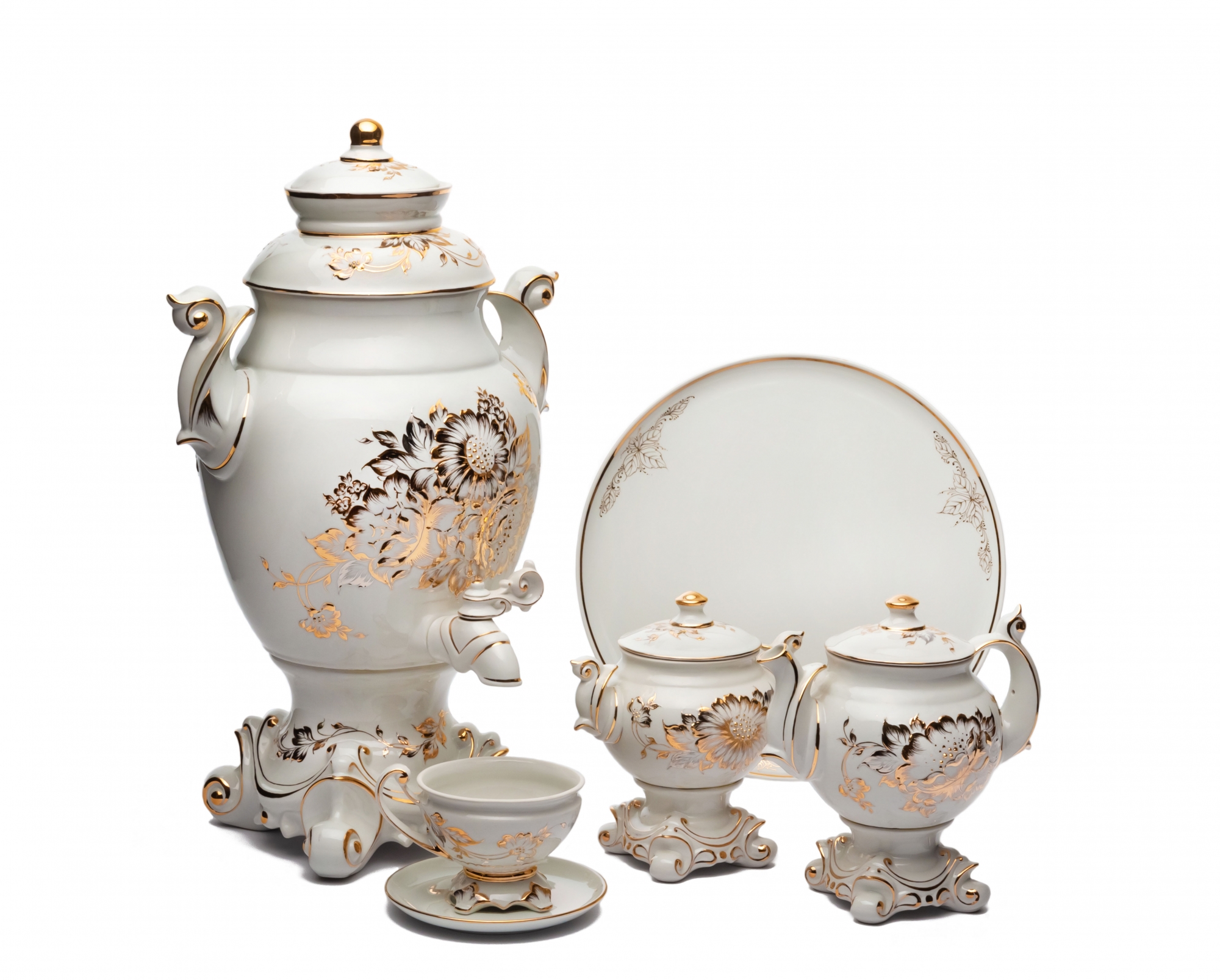 Кисловодский фарфор ручной работы. Наши изделия изготовлены из твердого фарфора с температурой обжига 1320 градусов, отливаются в ручную, поэтому могут иметь разный вес. Мы закупаем лучшие фарфоровые массы в мире, произведенные в Германии, Испании. Варианты декорирования используемые в оформлении наших электрических самоваров: лепнина, шликерная роспись, подглазурная роспись, надглазурная роспись, ангобное наращивание, процарапывание. Все наши изделия декорируются 12% препаратом жидкого золота, либо платины. Так же мы оформляем наши изделия различными видами люстровых красок, металликов. Все наши живописцы имеют максимальный пятый разряд, а так же многие из них награждены почетными грамотами, дипломами различных выставок, а так же министерств.