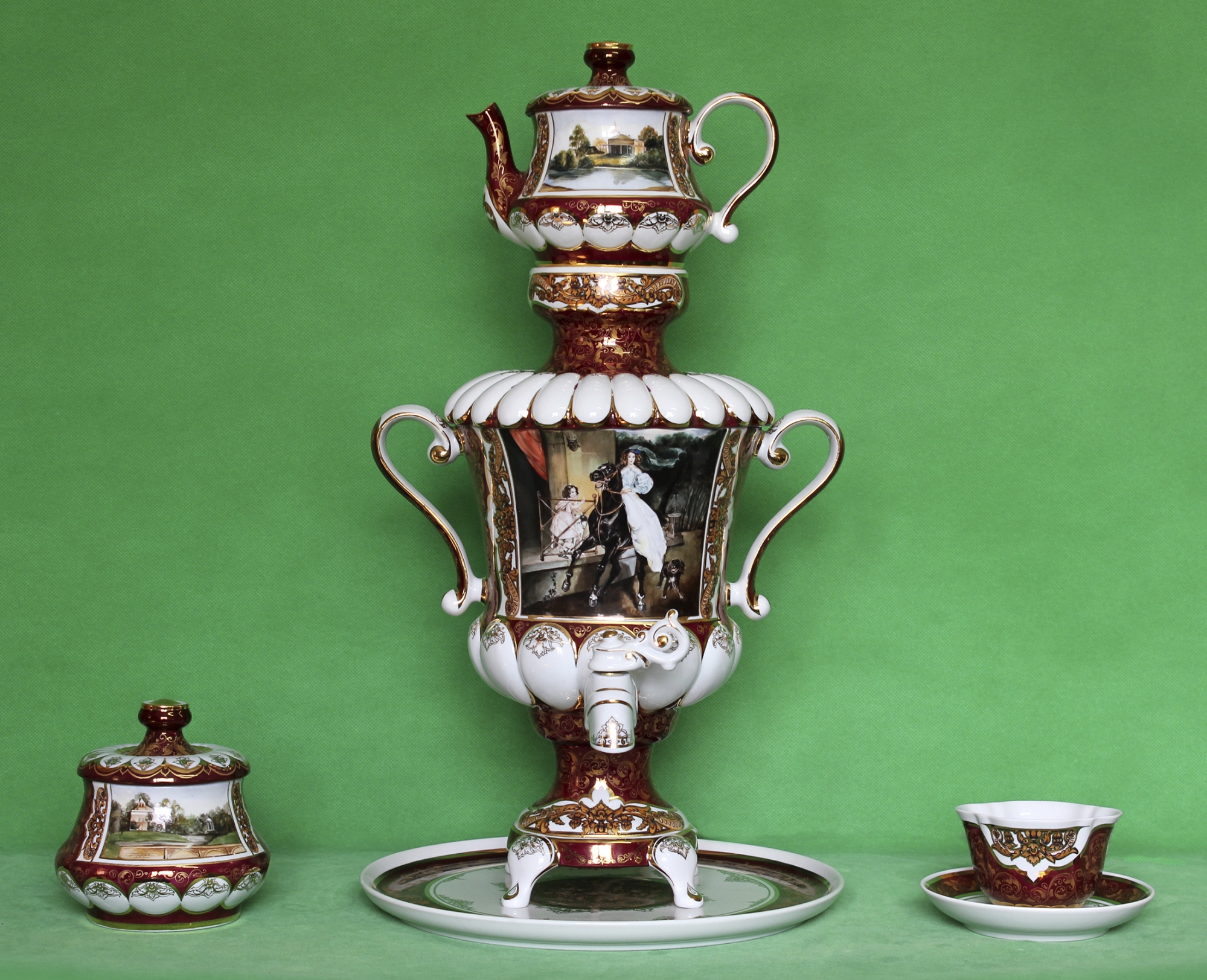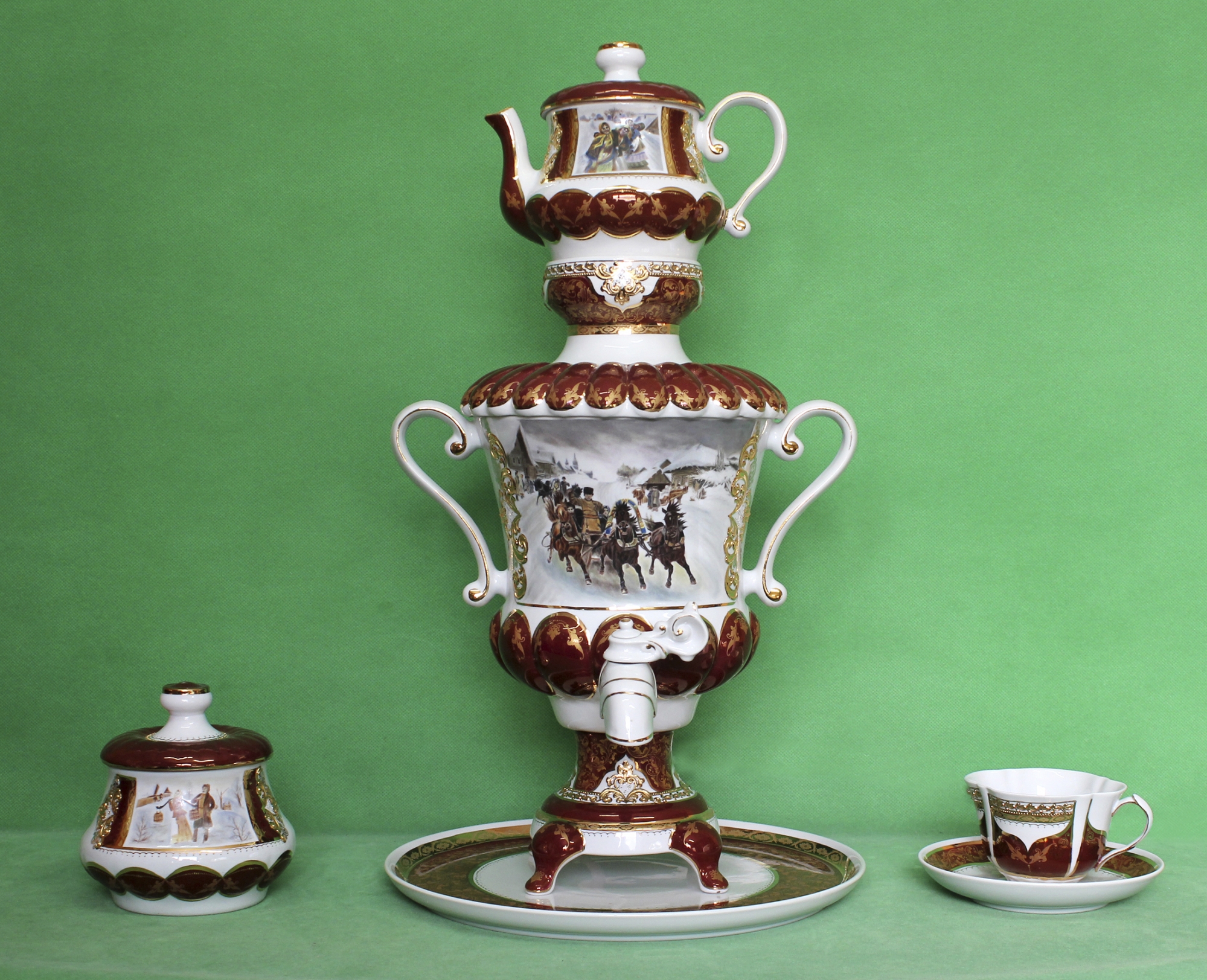 Комплектация: самовар, чайник-заварник, сахарница, блюдо-поднос, 6 чашек с блюдцами. Объем 2,5 литра.
